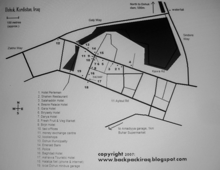 My Middle East guidebook helpfully has no section for Iraq, and with no internet, no Google maps, and no idea of what to expect, my sole source of guidance are these MS Paint-style maps, from a previous backpacker (pointing out essentials like "kebab shops" or "book market"), which I have photographed from a computer screen a few weeks ago: